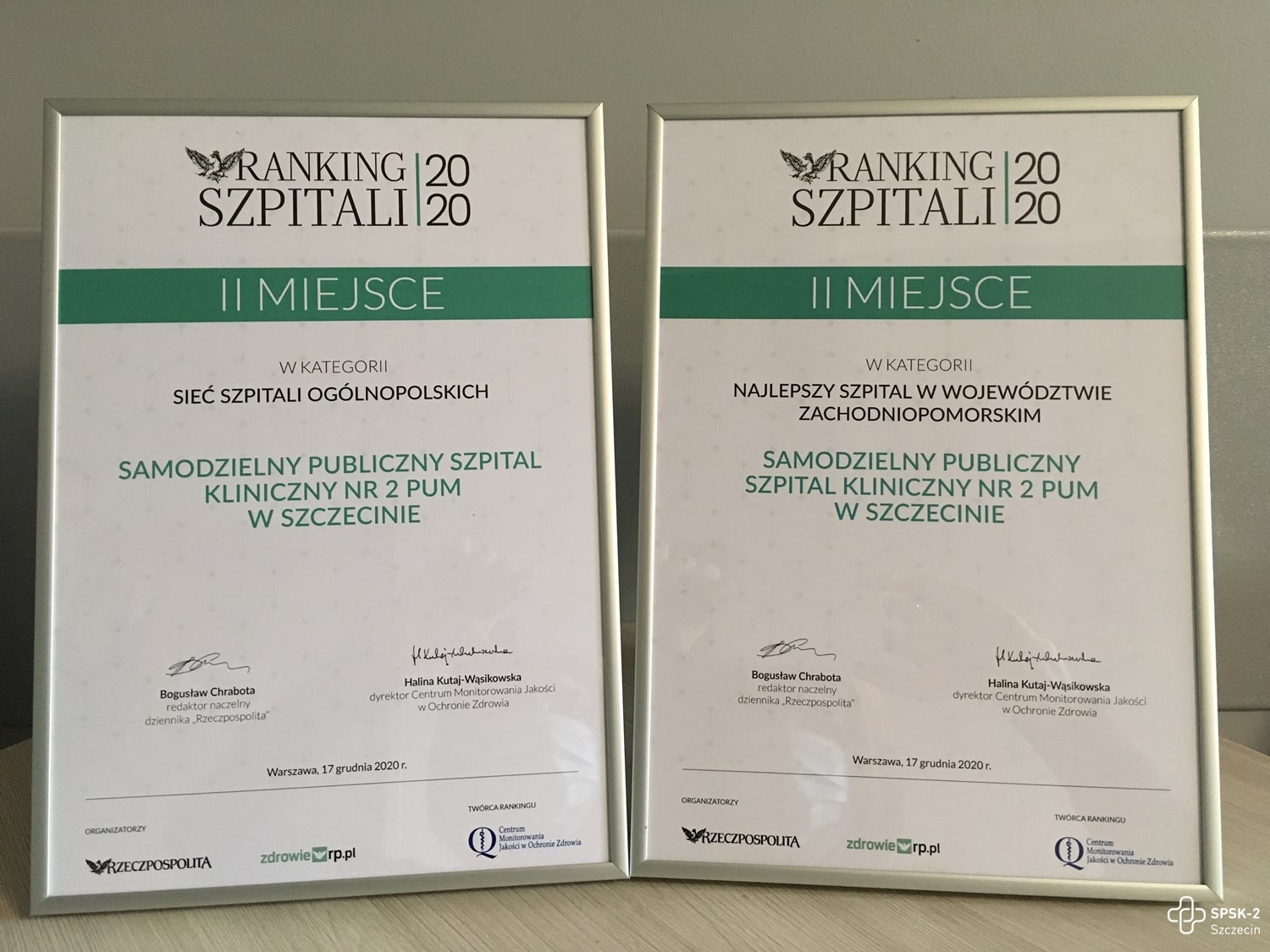 Nasz szpital w kategorii Sieć szpitali ogólnopolskich oraz Najlepszy szpital w województwie zachodniopomorskim zajął 2. miejsca. Całościowa punktacja z badań ankietowych jest podstawą do lokaty w tzw. Złotej setce. W tym roku szpital na Pomorzanach znalazł się na 16. miejscu, zdobywając 828,22 pkt. (rok temu było to miejsce 47. i 790 punktów). Zwycięzca Złotej setki zdobył 896,72 punkty. Czuję ogromną radość i dumę z całego zespołu naszego szpitala - mówi Marcin Sygut, dyrektor Uniwersyteckiego Szpitala Klinicznego Nr 2 PUM w Szczecinie – To wspólna i ciężka praca wszystkich jednostek i działów, a cel jest jeden – profesjonalna opieka nad pacjentem. To jest nasz priorytet – dodaje.