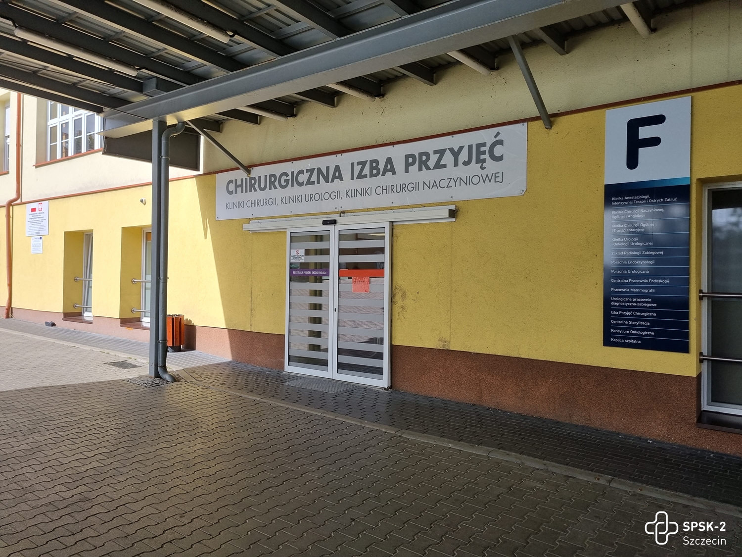 - przez budynek F, tuż obok z prawej strony – pod daszkiem podjazdu dla karetek, przez automatycznie rozsuwane drzwi, przejście przez Chirurgiczną Izba Przyjęć, w lewo do windy, wjazd na I piętro.