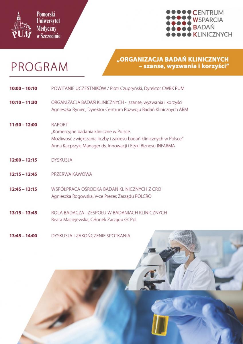 Centrum Wsparcia Badań Klinicznych PUM w Szczecinie zaprasza lekarzy będących członkami zespołów badawczych i lekarzy planujących udział w badaniach klinicznych na spotkanie pt. „ORGANIZACJA BADAŃ KLINICZNYCH – szanse, wyzwania i korzyści”.