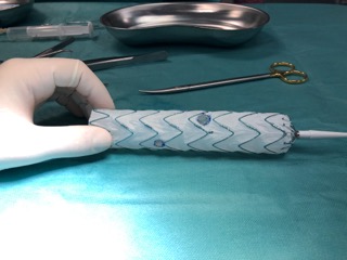 Zmodyfikowany stent-graft z widocznymi wyciętymi otworami na naczynia trzewne, fot. USK-2