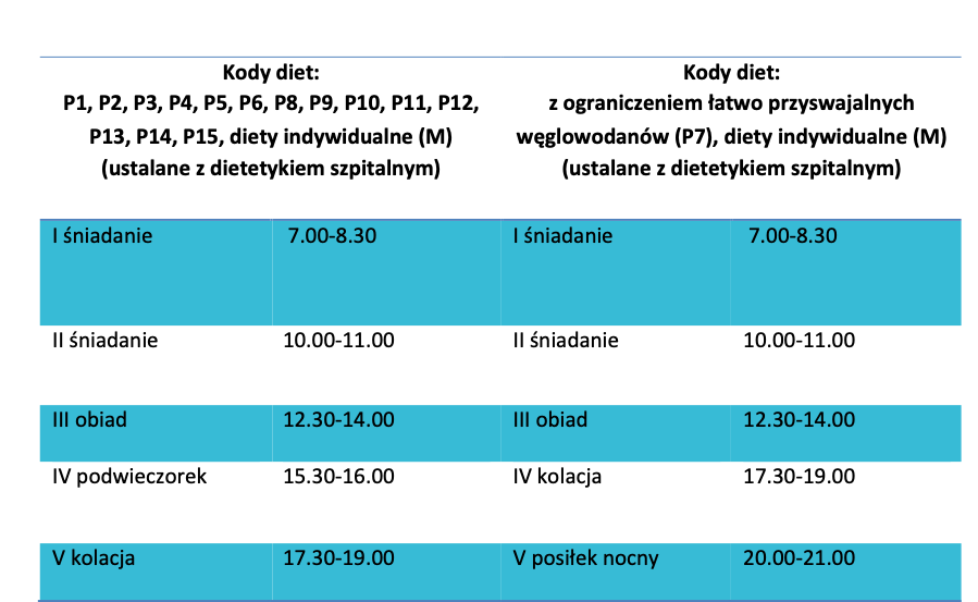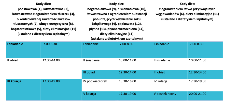 Pacjenci USK-2 otrzymują posiłki zgodnie z poniższymi schematami: