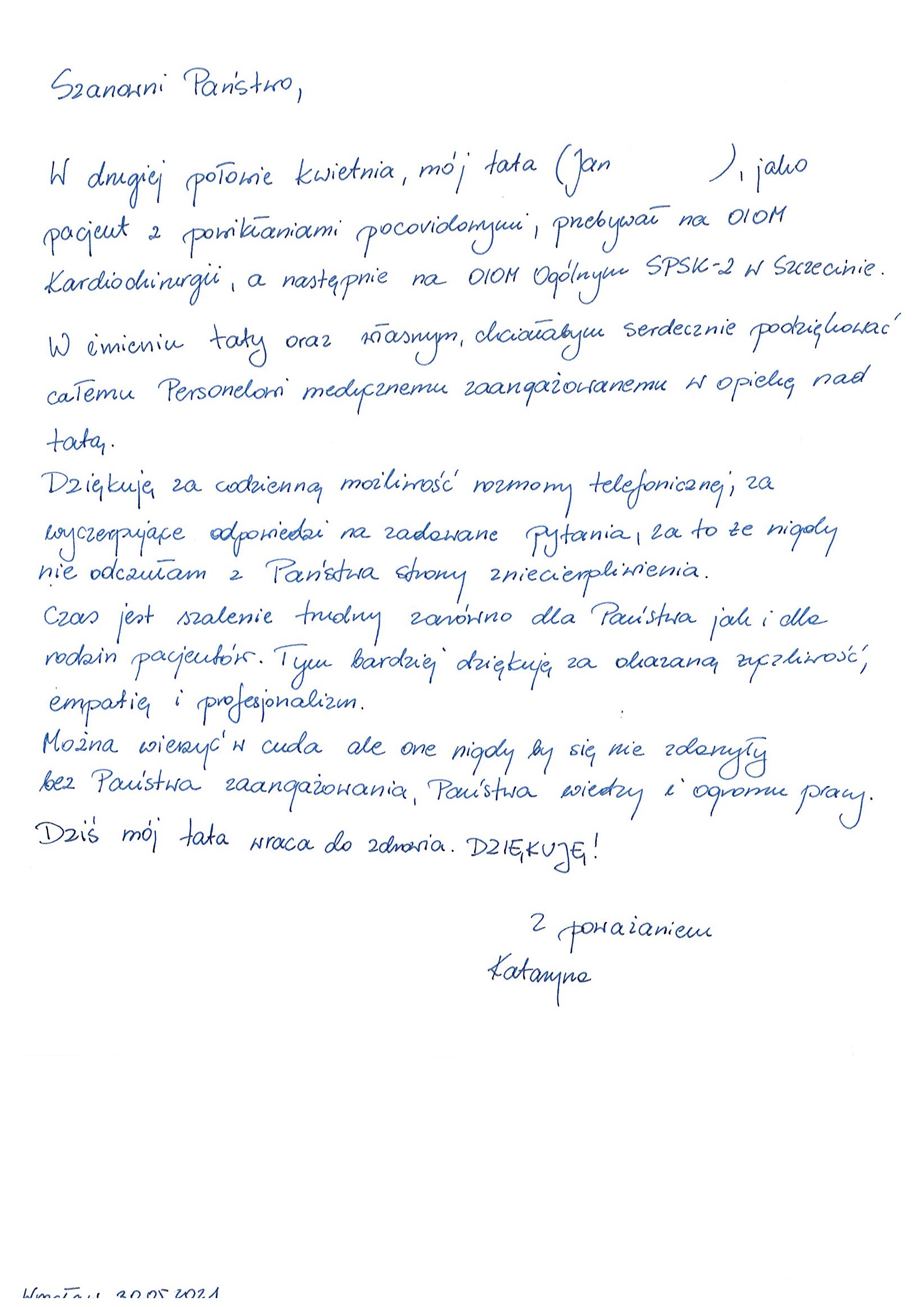 Podziękowania dla zespołu OIOM Kardiochirurgii i COVID