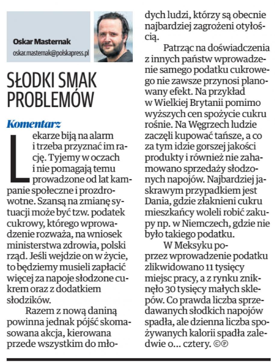 Na szczęście nie chodzi mi o strzelaniny ale o… przechodniów. Szczecińscy nastolatkowie wyglądają jak ich meksykańscy rówieśnicy – są grubi i zawsze mają przy sobie colę i czipsy. Mają też podobne problemy ze stawami („rozpoznanie uliczne”). Wyglądają gorzej niż ich rodzice czy dziadkowie. Po prostu Meksyk. Porównuję z Meksykiem, gdyż tam jest największy odsetek otyłych – 33% populacji i tam jest największe na świecie spożycie coli – 700 ml dziennie na 1 mieszkańca, czyli 330 kcali („pustych”) dziennie. Gdyby ten przeciętny Meksykanin zamiast coli pił wodę, mógłby chudnąć w tempie 17 kg/ rok! Mamy podobne oczekiwanie wobec naszych nastoletnich (i nie tylko nastoletnich) współobywateli. Mimo że jeszcze tak dużo coli nie pijemy, to i tak nasi nastolatkowie stają się liderami w otyłości. Otwieramy się na Amerykę, jak kiedyś otworzył się Meksyk. Po podpisaniu porozumienia NAFTA – o wolnym handlu między krajami Ameryki Płn., spożycie coli przez przeciętnego Meksykanina wzrosło 2,5 krotnie. Wszędzie gdzie pojawili się Amerykanie zaczęło rosnąć spożycie coli. Mieszkaniec Chile wypija dziennie 400 ml produktów Coca coli, Panamy i Argentyny po ok. 300 ml, a mieszkaniec USA 360 ml. Nadmierne spożycie słodkich napojów nie jest obojętne nie tylko dla wyglądu, ale przede wszystkim dla zdrowia. Słodycze powodują błogość i związane z nią rozleniwienie – niechęć do aktywności fizycznej i umysłowej. Poza tym cukier prowadzi do rozwoju próchnicy zębów, oczywiście do otyłości i związanej z nią cukrzycy typu 2, do nadciśnienia tętniczego, przyspieszonej miażdżycy, skutkującej zawałem serca czy udarem mózgu (brr!). Na początku XX wieku – mieszkaniec bogatego kraju spożywał 15 kg cukru rocznie. Otyli stanowili 6% populacji, tyle samo miało nadciśnienie tętnicze, cukrzyca typu 2 była bardzo rzadka (0,1% populacji). Na początku XXI wieku roczne spożycie cukru wynosiło 67 kg na mieszkańca np. USA, otyli stanowili 31% populacji, prawie 1/3 miała nadciśnienie tętnicze, a ponad 7% cukrzycę typu 2. Cukier w wypiekach i słodyczach zamieniliśmy na cukier w napojach – łatwiej przyswajalny i łatwiej prowadzący do otyłości.