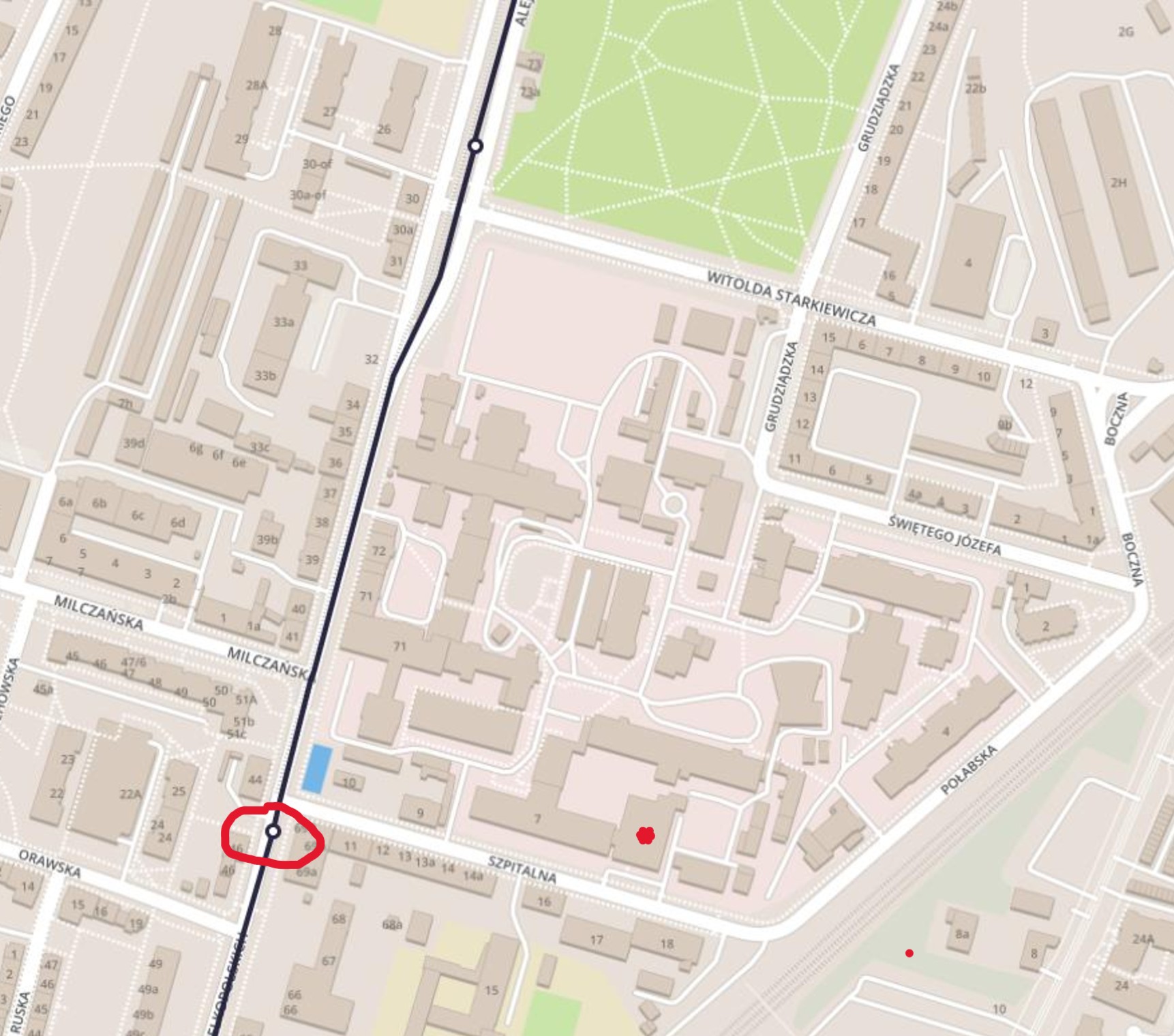 Dla pacjentów jadących tramwajem (np. nr 11, 12) od strony centrum miasta w kierunku Pomorzan - zalecamy wysiadanie na przystanku Szpitalna (a nie jak do tej pory Starkiewicza)