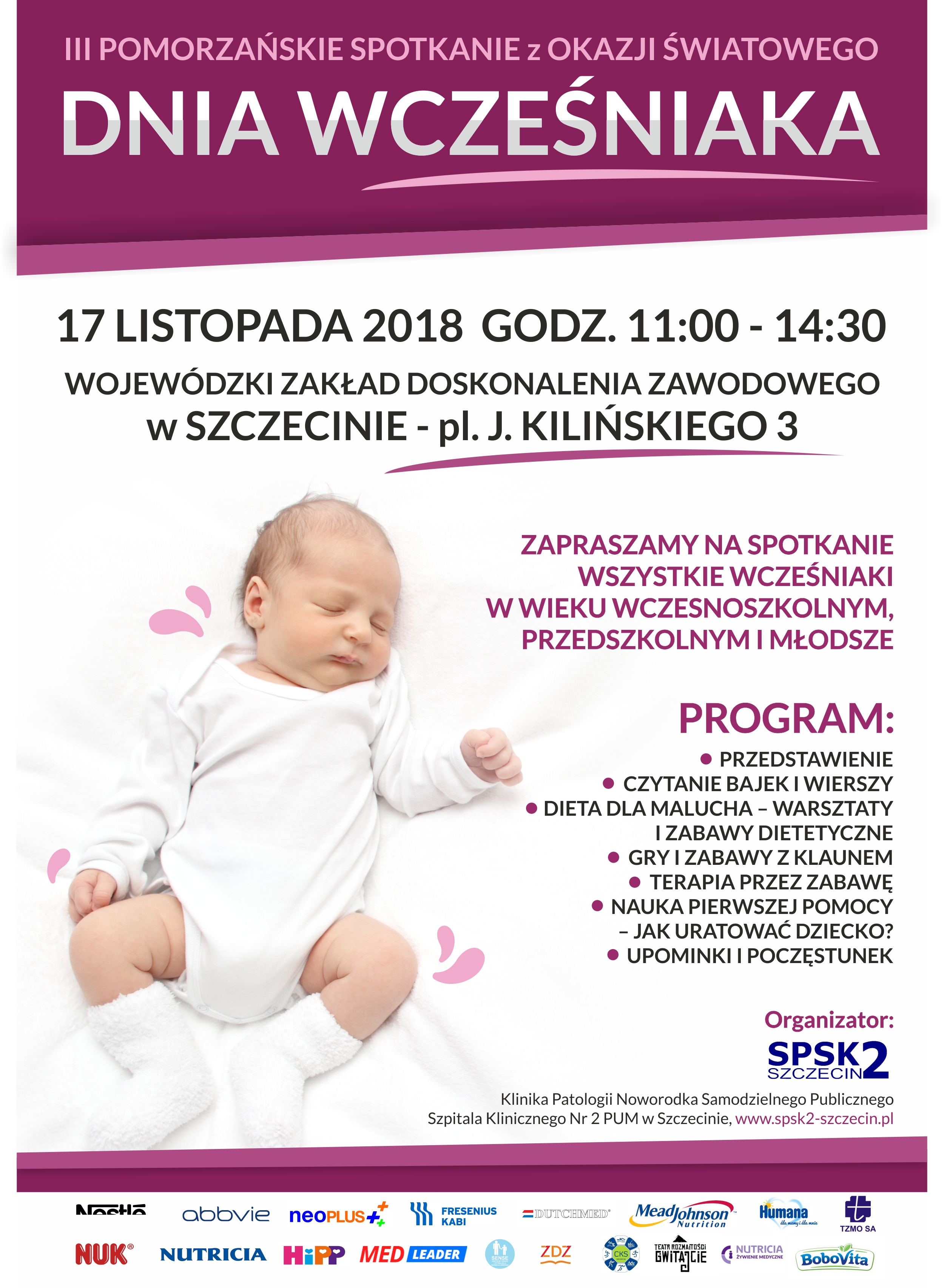 Dzień Wcześniaka organizowany jest przez zespół pracowników Kliniki Patologii Noworodka USK-2 po raz trzeci. Serdecznie zapraszamy wszystkie wcześniaki i ich rodziców do wspólnej zabawy, czytania bajek, zdrowych przekąsek i innych niespodzianek - mówi dr hab. n. med. Beata Łoniewska, lekarz kierująca Kliniką Patologii Noworodka szpitala na Pomorzanach. Czekamy na wszystkie wcześniaki, także te, urodzone w innych szpitalach naszego miasta i regionu – dodaje mgr Anna Romańska, pielęgniarka oddziałowa Kliniki Patologii Noworodka USK-2.
