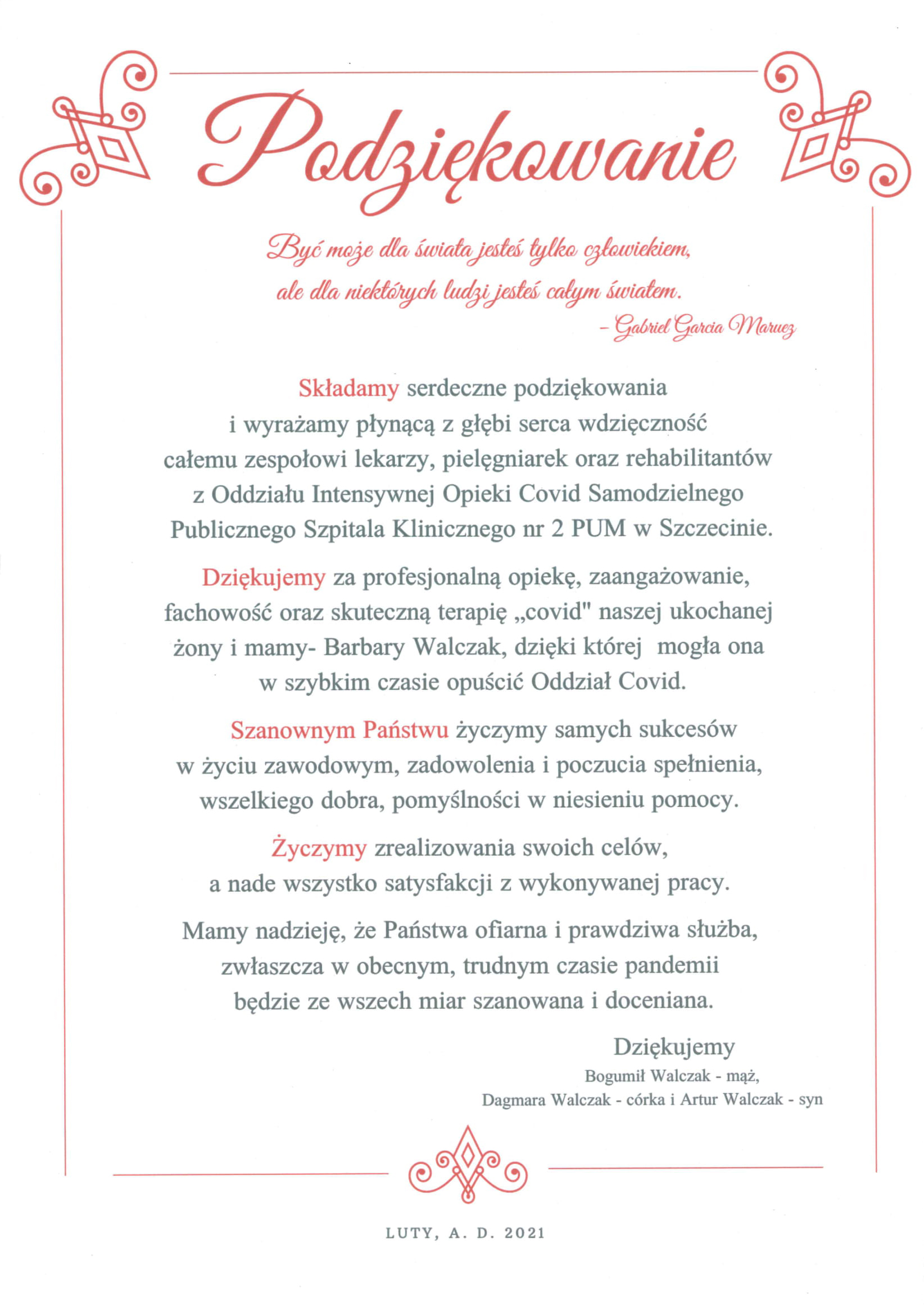 Podziękowania dla zespołu OIOM COVID