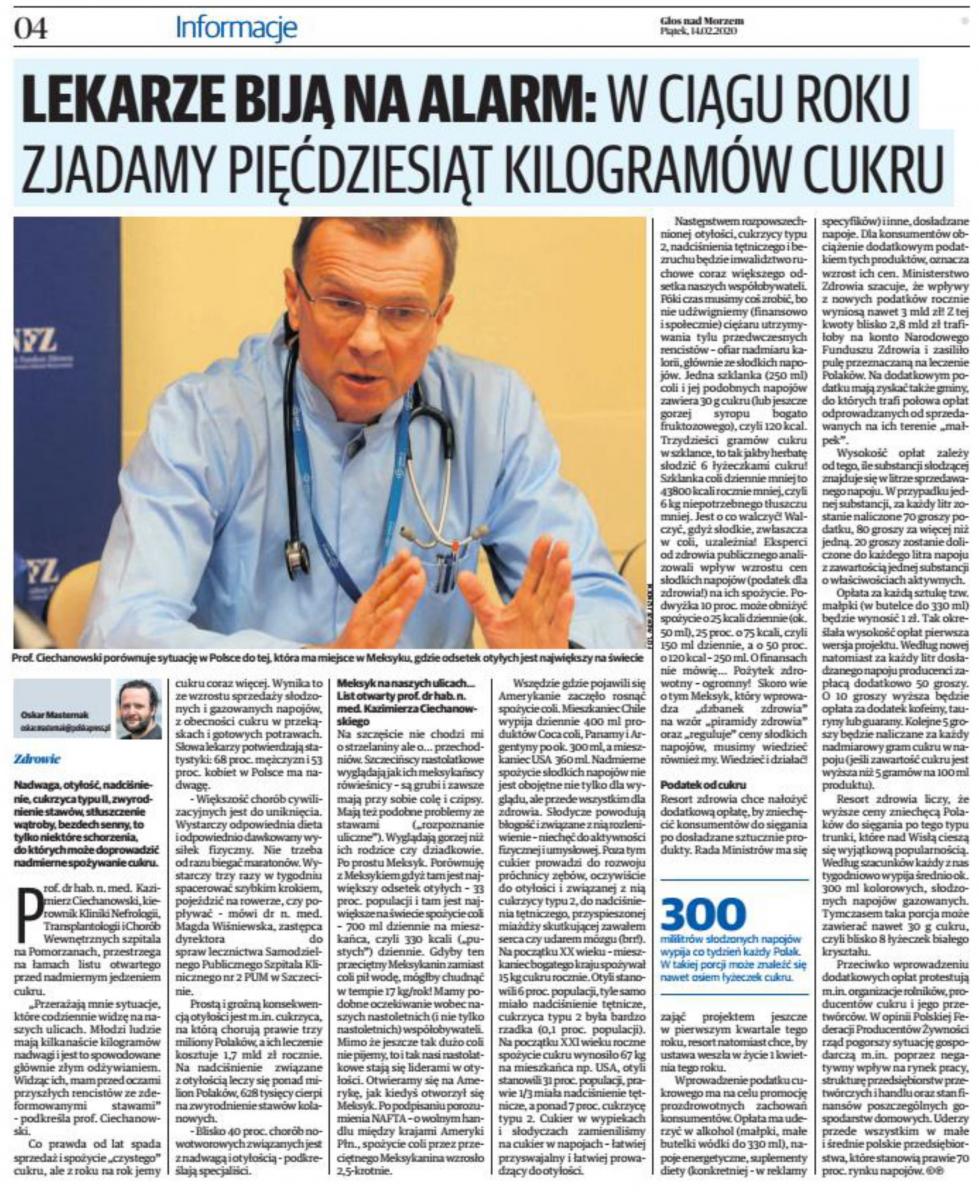 W związku z ogólnopolską kampanią Narodowego Funduszu Zdrowia dotyczącą szkodliwości nadmiaru cukru w diecie Polaków stanowisko w tej sprawie zajął prof. dr hab. n. med. Kazimierz Ciechanowski – specjalista chorób wewnętrznych, diabetologii, nefrologii, transplantologii klinicznej oraz medycyny sportowej, lekarz kierujący Kliniką Nefrologii, Transplantologii i Chorób Wewnętrznych naszego szpitala.