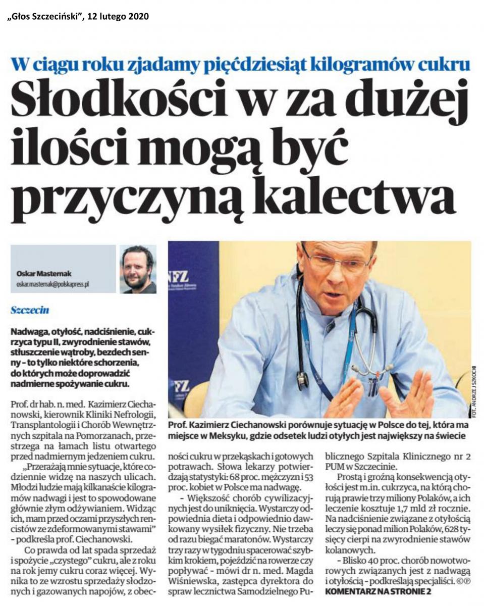 Profesor Ciechanowski i dr n. med. Magda Wiśniewska, specjalista chorób wewnętrznych, diabetologii, nefrologii i transplantologii klinicznej, zastępca dyrektora ds. lecznictwa USK-2 wzięli udział w organizowanym z udziałem Zachodniopomorskiego Oddziału Wojewódzkiego Narodowego Funduszu Zdrowia w Szczecinie spotkaniu z mediami, na którym przestrzegali przez szkodliwością spożywania nadmiernej ilości cukru w żywności i kolorowych, słodzonych napojach.