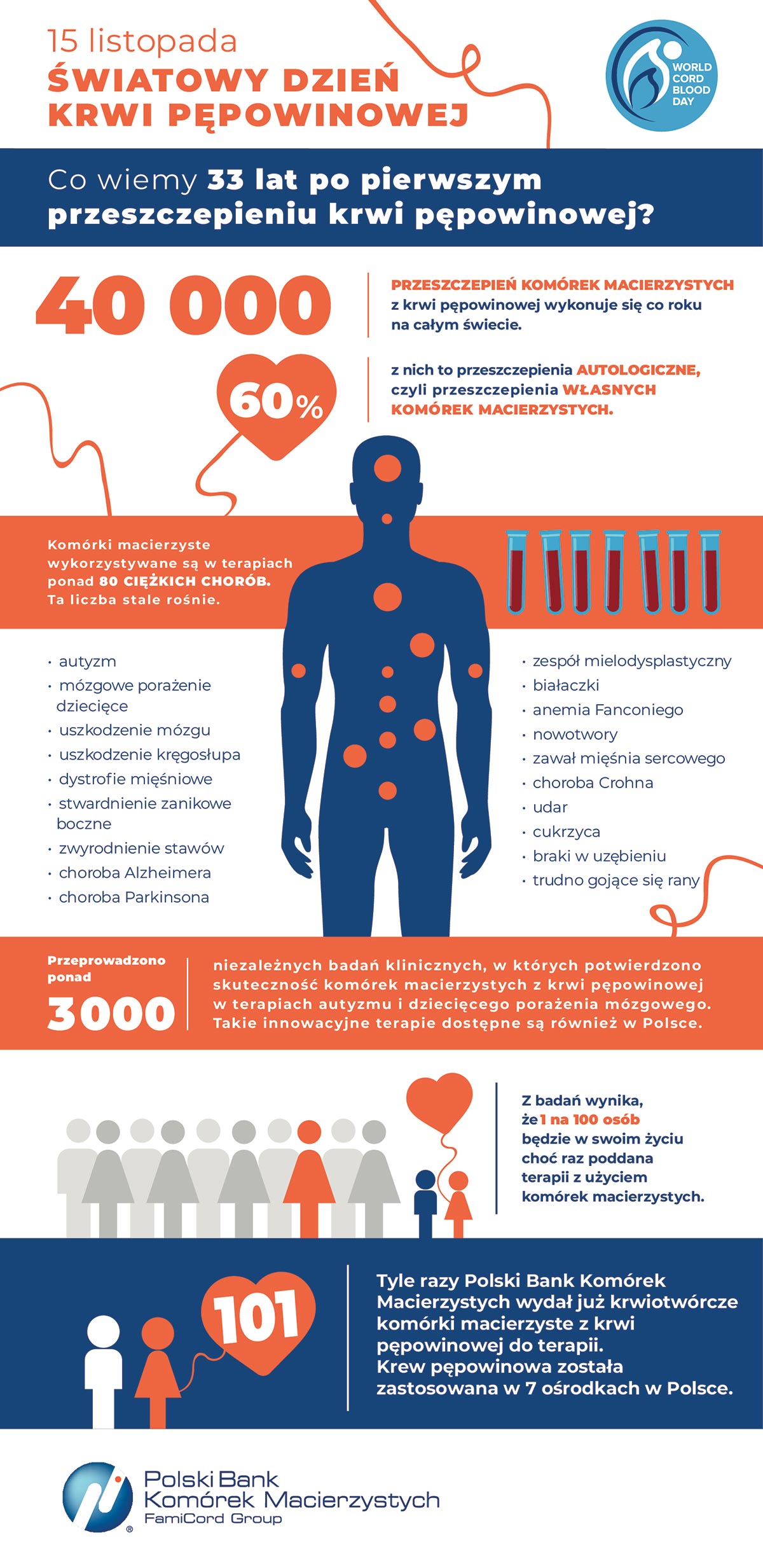 Dni Krwi Pępowinowej to akcja społeczna, która odbywa się w polskich szpitalach po raz szósty. Jej celem jest zwiększenie publicznych zasobów krwi pępowinowej w Polsce, a tym samym wzrost liczby przeszczepień komórek macierzystych. W Polsce ilość zdeponowanych porcji krwi pępowinowej jest zdecydowanie mniejsza niż w USA i Europie Zachodniej. Na świecie wykonano już ponad 40 tysięcy transplantacji krwi pępowinowej u dzieci i dorosłych. W tegorocznych Dniach Krwi Pępowinowej bierze udział 12 wybranych szpitali na terenie Polski. Z pobranej w tej sposób krwi będą mogły skorzystać osoby potrzebujące terapii komórkami macierzystymi z krwi pępowinowej z Polski i świata.