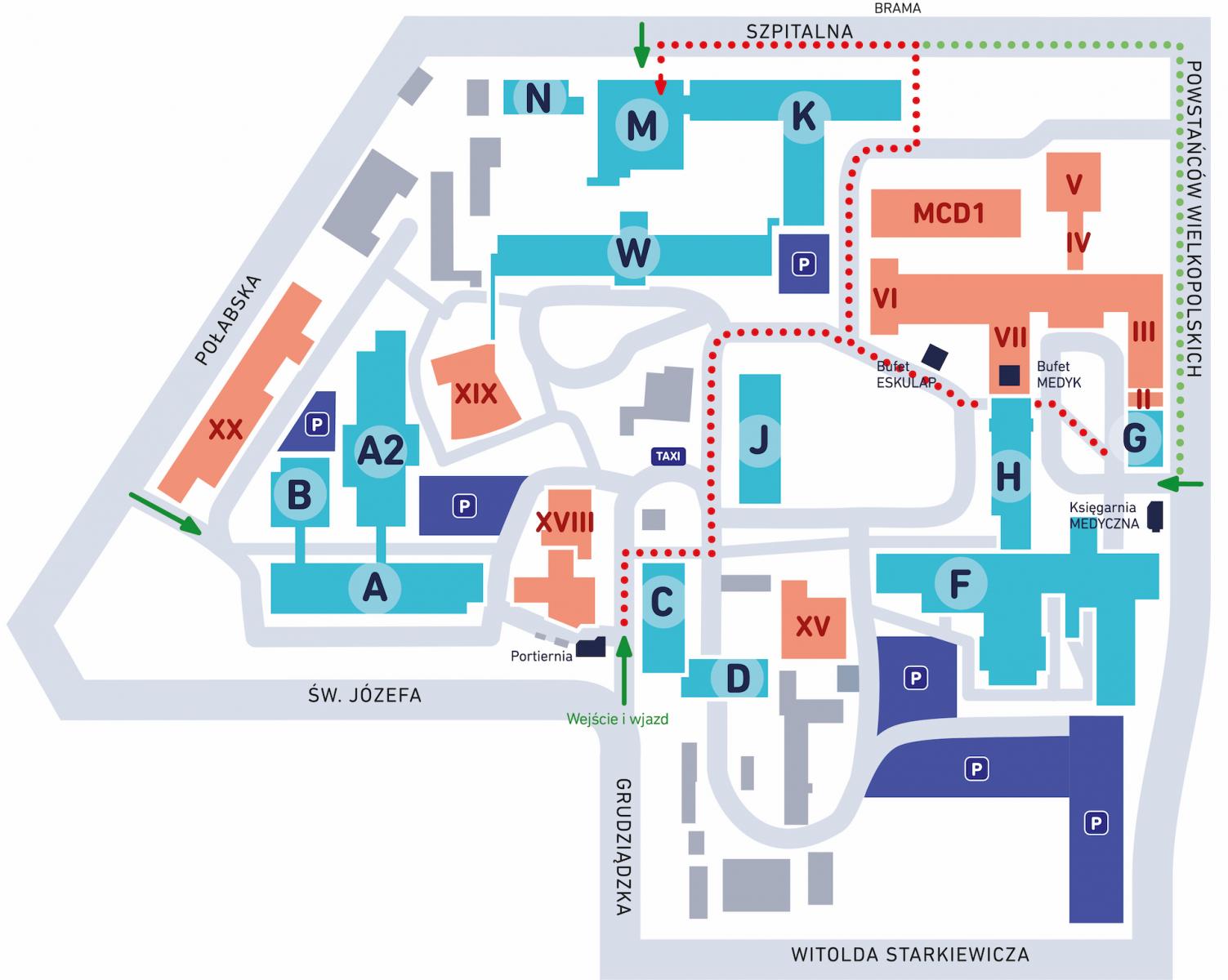 - Wejście z zewnątrz terenu szpitala – ZALECANE! (na mapce poniżej droga oznaczona na zielono):